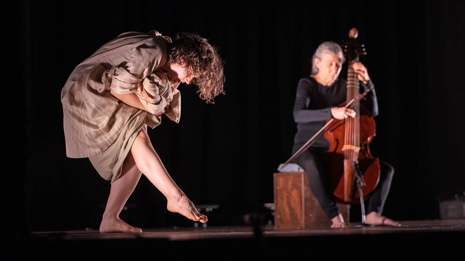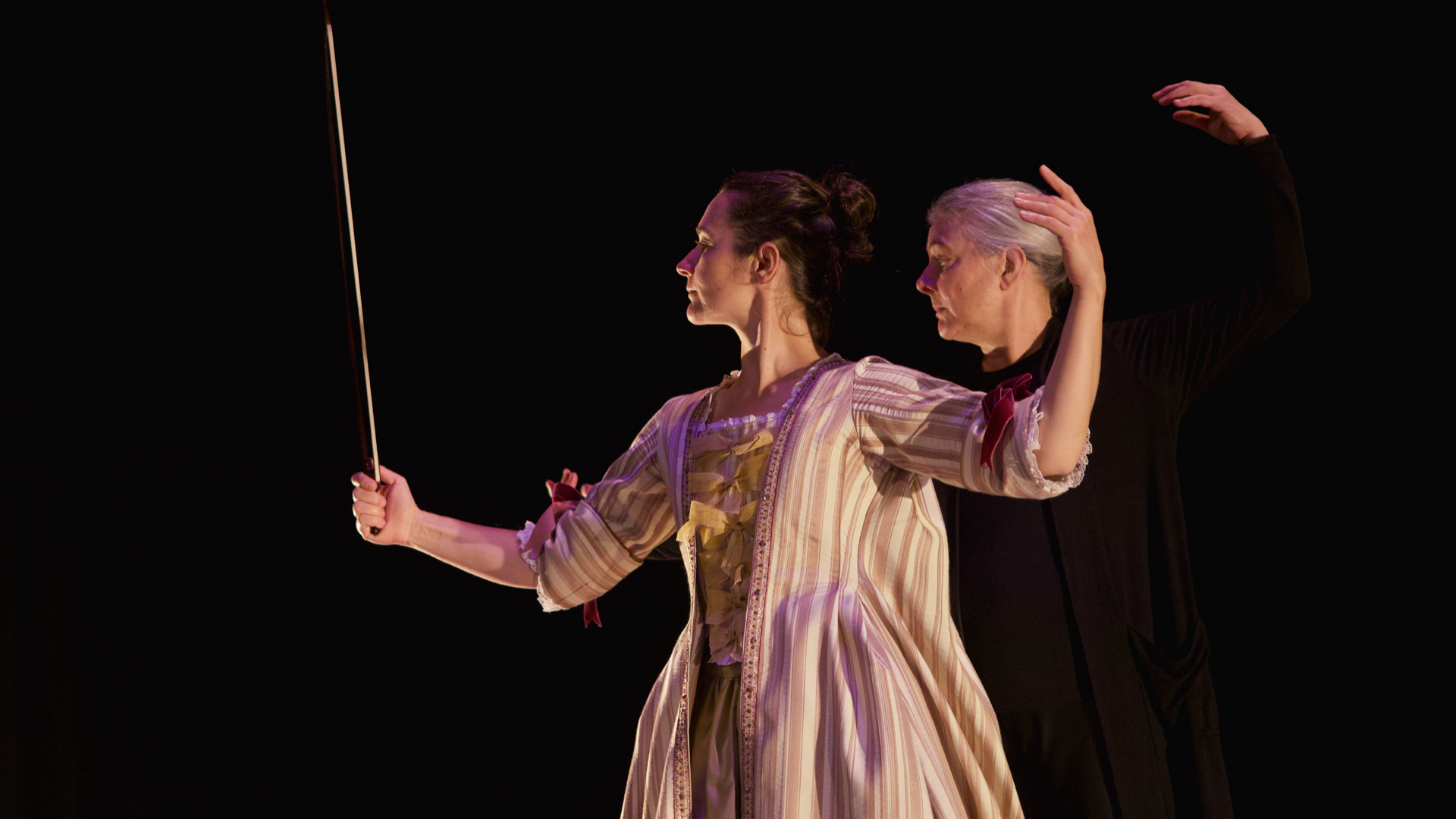 La musique, interprétée en direct, occupe une place centrale. La viole de gambe incarne une voix intérieure, tantôt soutenante, tantôt provocante, toujours en dialogue avec le corps dansant. La musiciennne devient un partenaire de jeu et prend une part active à la dramaturgie.