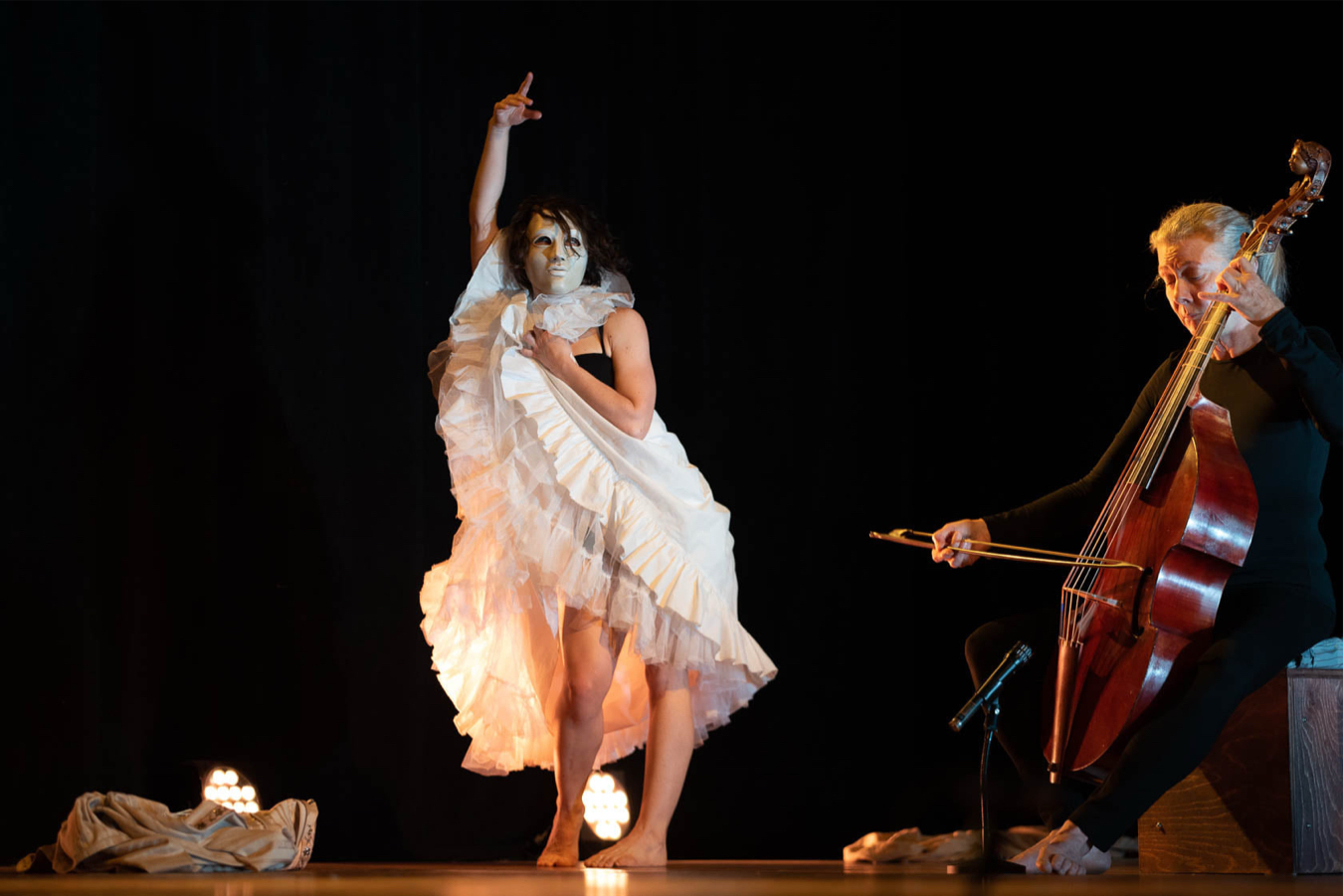 La musique, interprétée en direct, occupe une place centrale. La viole de gambe incarne une voix intérieure, tantôt soutenante, tantôt provocante, toujours en dialogue avec le corps dansant. La musiciennne devient un partenaire de jeu et prend une part active à la dramaturgie.
